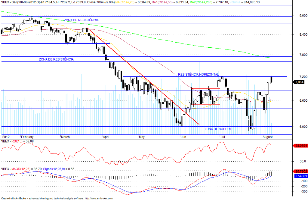 Caso o Ibex não quebre já em alta a zona dos 7200 era importante que a cotação não viesse abaixo dos 6850 pontos. Aliás, uma vinda a valores próximos desta zona, poderá ser uma boa oportunidade para o Ibex ganhar força e para entrar longo.