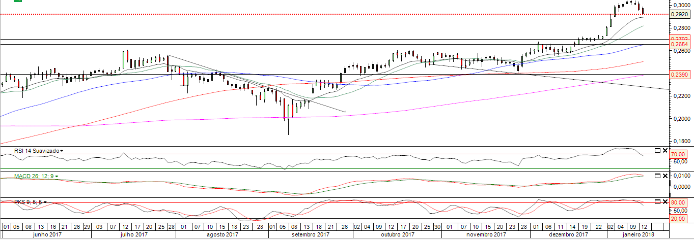 Neste momento os indicadores técnicos RSI, MACD e STKS estão em níveis bastante elevados e provavelmente poderão vir para níveis inferiores para aliviar .