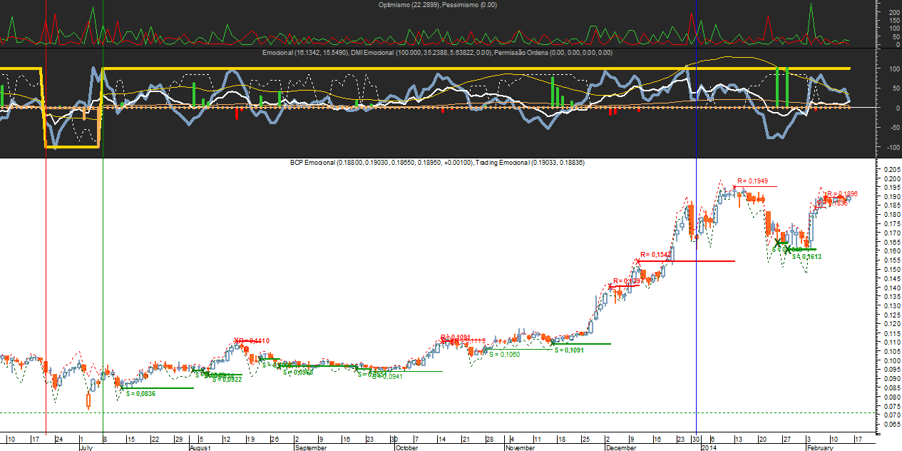 Os indicadores atrás indicados, que formam a base da definição da tendência no "Emocional 2014" podem-se resumir a 2 indicadores que são visualizados no gráfico de cima do BCP (ver gráfico no final deste post).