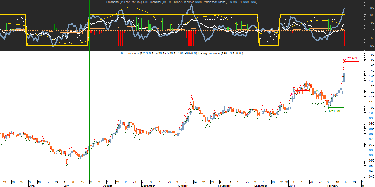 No final da sessão de 2ª feira o programa assinala no BES a deteção de uma resistência importante, para vender a totalidade da componente oscilatória, isto para o caso da cotação atingir, na sessão do dia 18 de fevereiro, o valor de 1,481 €, um valor que o programa assinala como possível nível de resistência aproximada de curto prazo.
