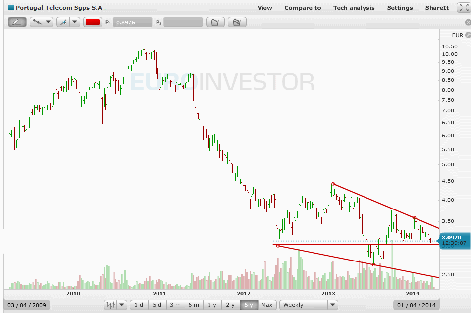 Por curiosidade fui ver o gráfico da Oi e nem fazia ideia do profundo Bear market em que esta se encontra, ja que em janeiro de 2009 cotava acima dos 17 reais e hoje esta nos 3,25. E algo semelhante se passa na PT que desde o máximo que atingiu aquando da venda da VIvo, entrou tambem num ja longo Bear market.
