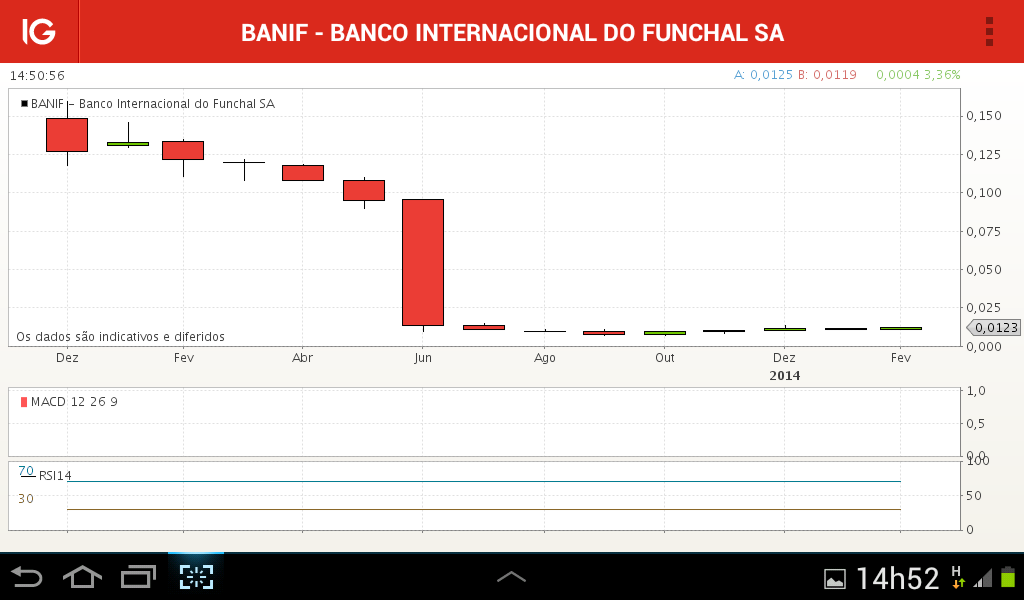 Boa tarde a todos. O BANIF parece querer "despertar do coma", já lá vão 3,5 meses a subir. Neste momento para mim era importante consolidar nos 0,012€ para atacar os 0,013€. A partir daí não vejo resistências até aos 0,045/0,05€, o que não quer dizer que seja sempre a subir. Abaixo dos 0,011€ salto fora.