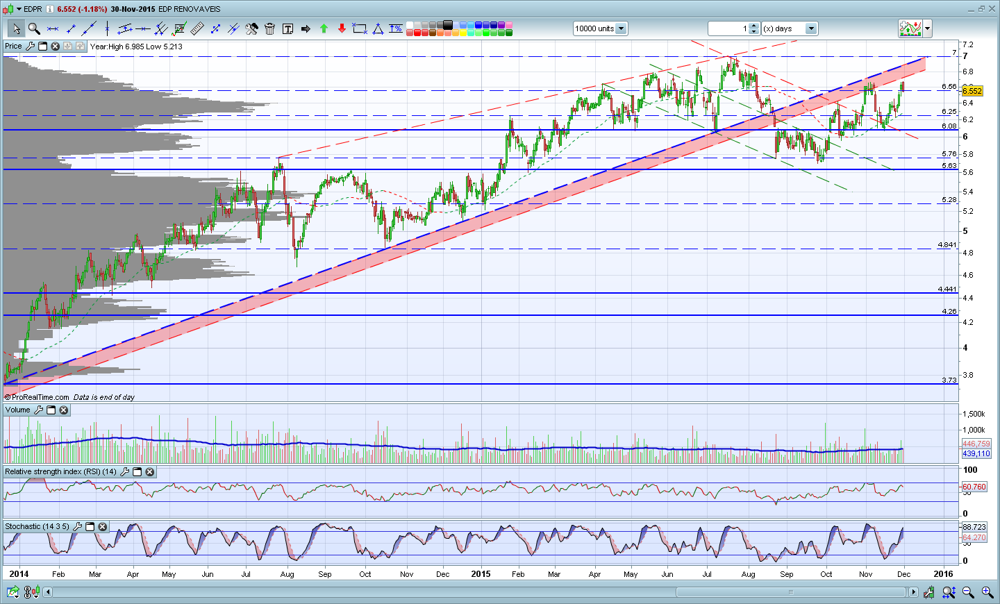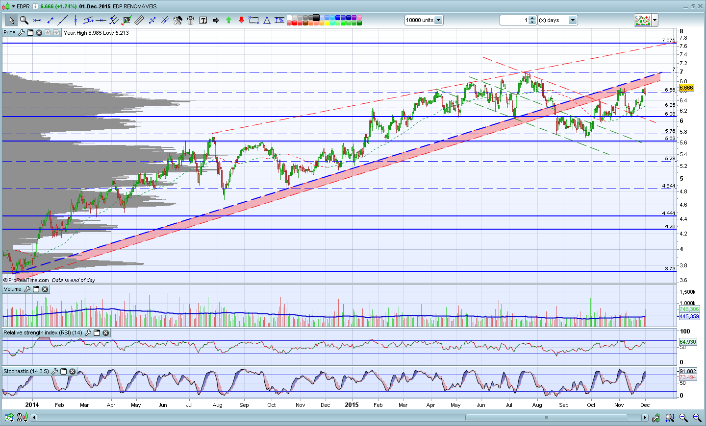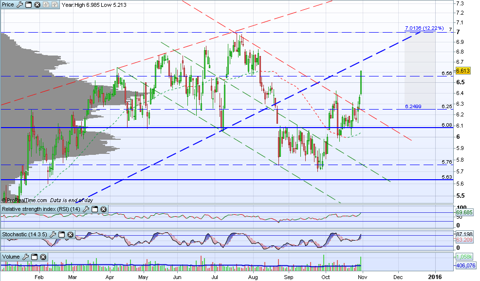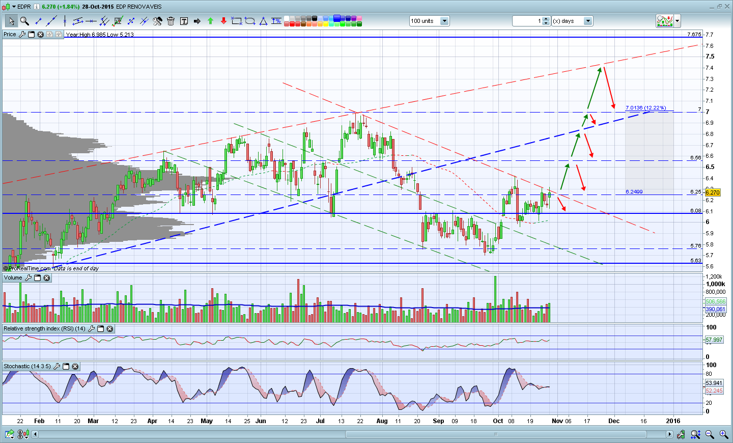 O que posso concluir segundo o meu gráfico é que a EDPr encontrasse perto duma resistência obliqua que pode fazer com que o preço vá para a casa de partida (6,0x) no curto prazo. Estamos também muito perto duma resistência de curto prazo (7) que penso que pode ser visitada brevemente e temos os indicadores a entrar em sobre-comprado.