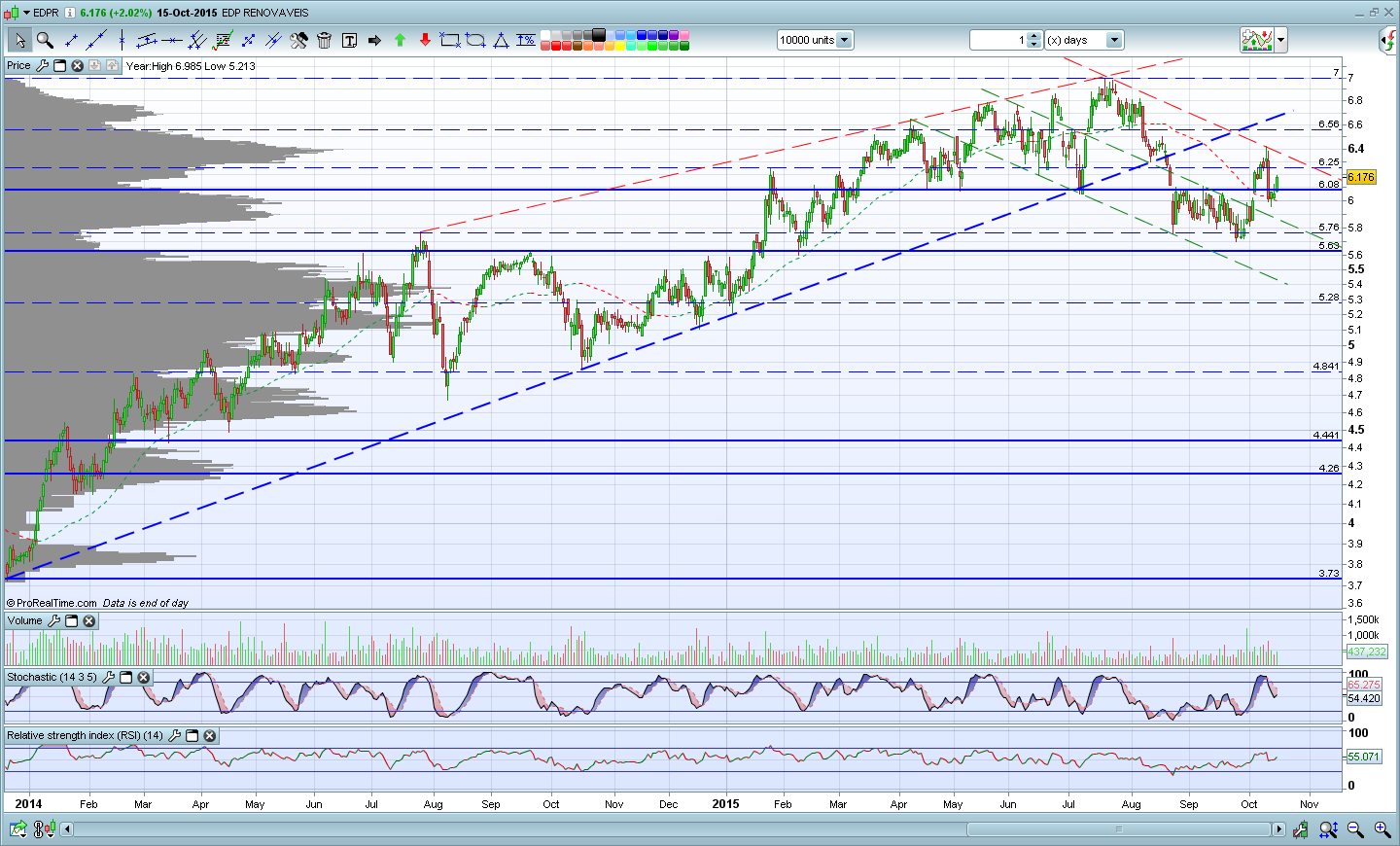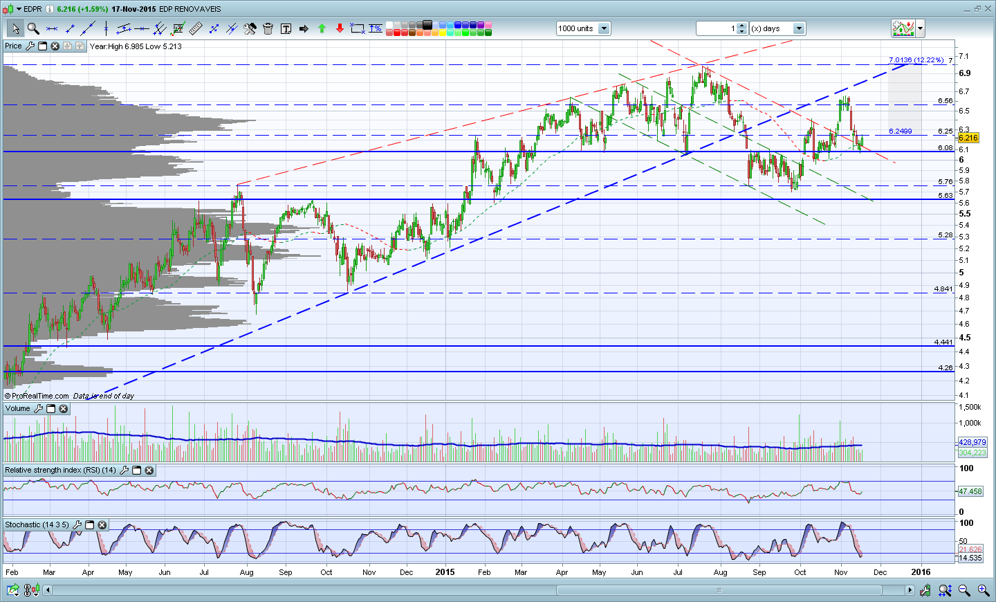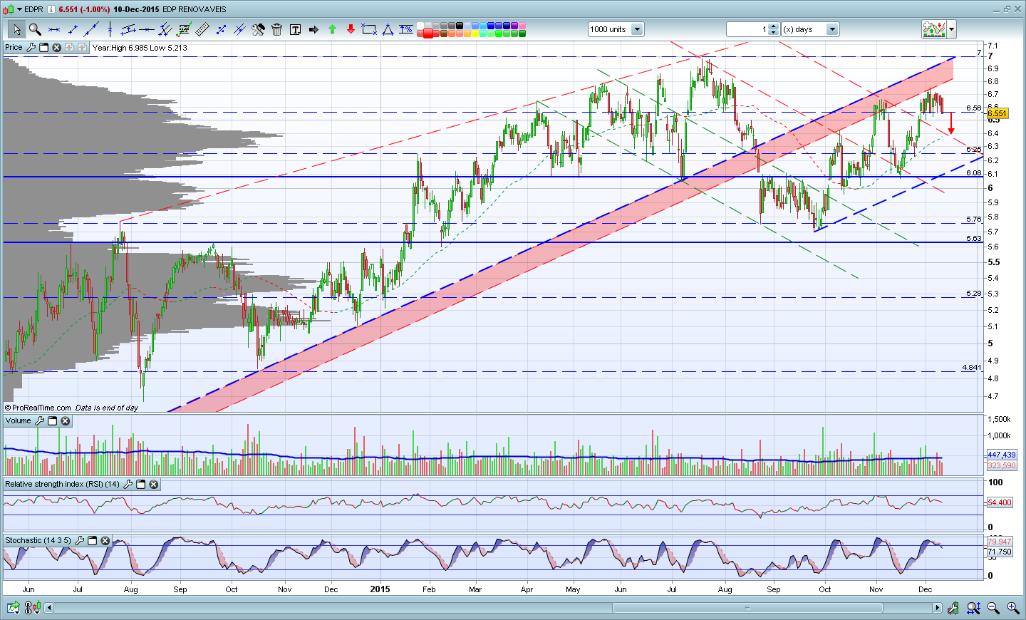 O que posso concluir segundo o meu gráfico é que a EDPr encontrasse perto duma resistência obliqua que pode fazer com que o preço vá para a casa de partida (6,0x) no curto prazo. Estamos também muito perto duma resistência de curto prazo (7) que penso que pode ser visitada brevemente e temos os indicadores a entrar em sobre-comprado.
