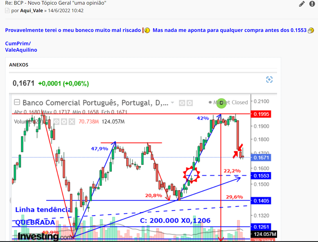 Post scriptum: claro que a entrada nestes valores será perto de all in, para um investimento tipo depósito a prazo a 12 meses, e para saír, no mínimo, aos 0,20. Se chegar ao ponto de entrada - como espero - e ficar dentro irei depois dar feed-back disto, como há uns meses atrás, quando a cotação andava pelos 0,12 eu aqui, repetidamente, afirmava que iria chegar aos 0,20 até ao final de 2021 ( basta pesquisar os meus post's de março/abril ). Errei por pouco, chegou lá no início de fevereiro e obviamente que aproveitei. Depois ainda dei mais um tirinho, aliás bem proveitoso.