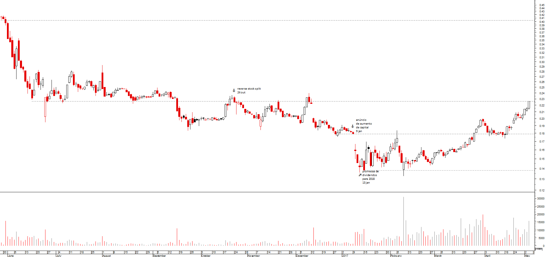 Na minha opinião, está neste momento a bater na resistencia no intervalo entre os 0,23 e os 0,245€+-. Vamos ver se tem força para a romper ou vai retrair para aliviar um pouco das subidas recentes.