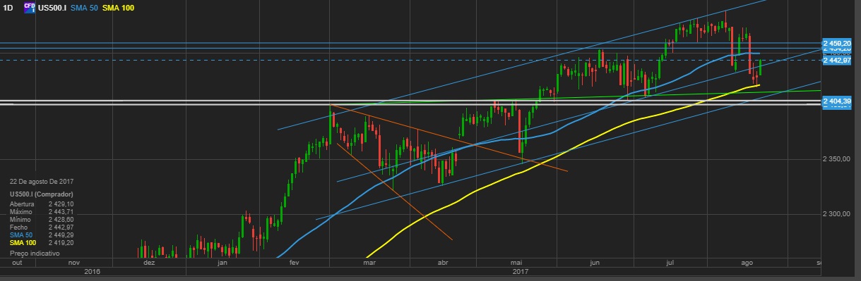 Tenho alguma dificuldade em acreditar que nesta fase SP500 consiga ultrapassar a zona 2480 - 2500. Acho que na melhor das hipóteses consolida até final de agosto antes da esperada volatilidade para os 2 meses seguintes .