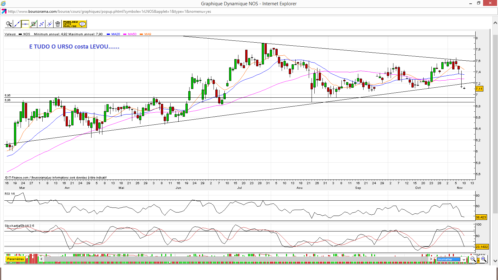Mas isto é apenas a MHO para me manter fora da NOS por enquanto excepto para o trade que disse acima aproveitando um range maximo de lateralização de 0.7€ portanto ganho maximo por ação de 10% assumindo o risco maximo e pontos de entrada saida optimos.
