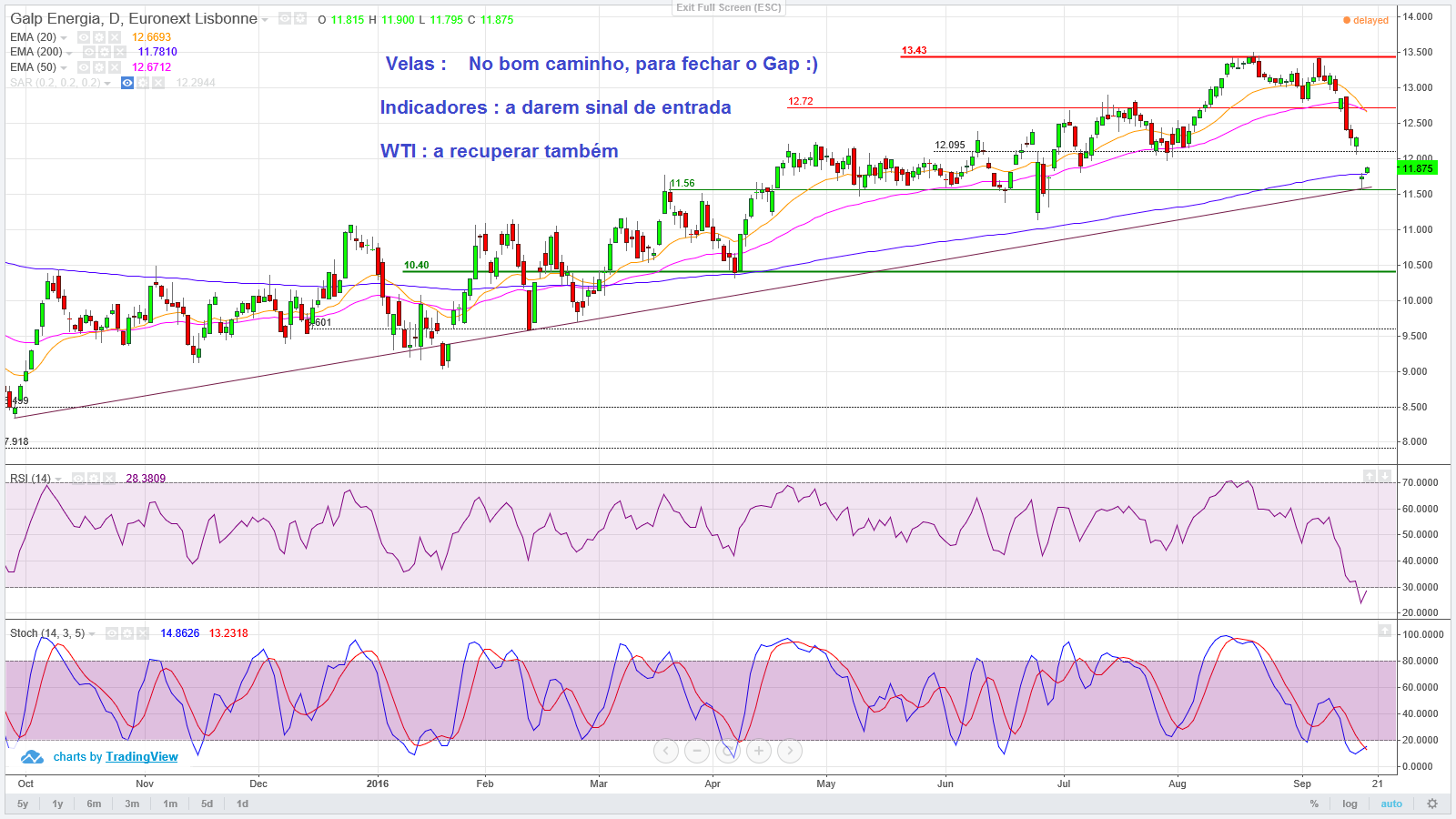 Fecho abaixo do suporte de 12,17€ no gráfico semanal. Poderá ir fechar o gap criado no dia 16 e aí veremos se estes 12,17€ passaram de suporte a resistência. Não me parece altura de entrar. Caso tenha fecho semanal acima de 12,17€, será bom sinal.