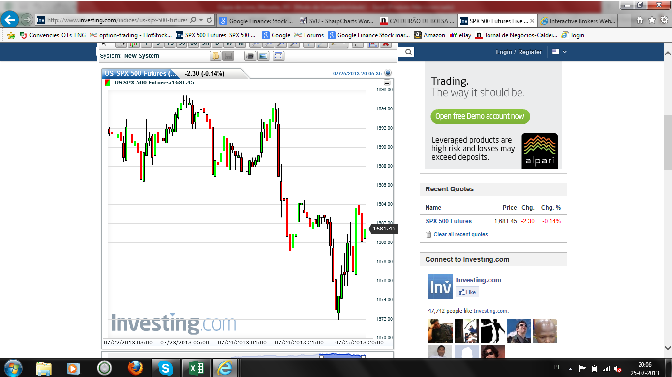 rg7803 Escreveu:hoje estive para meter um short no /ES (futuros) nos 1680. Vejam aquele doji seguido da vela vermelha, cerca de 3 horas atrás (as velas são horárias). A conjugação das 3 velas dá uma evening star que é habitualmente um padrão forte, ainda para mais qdo a vela do meio é um doji.
