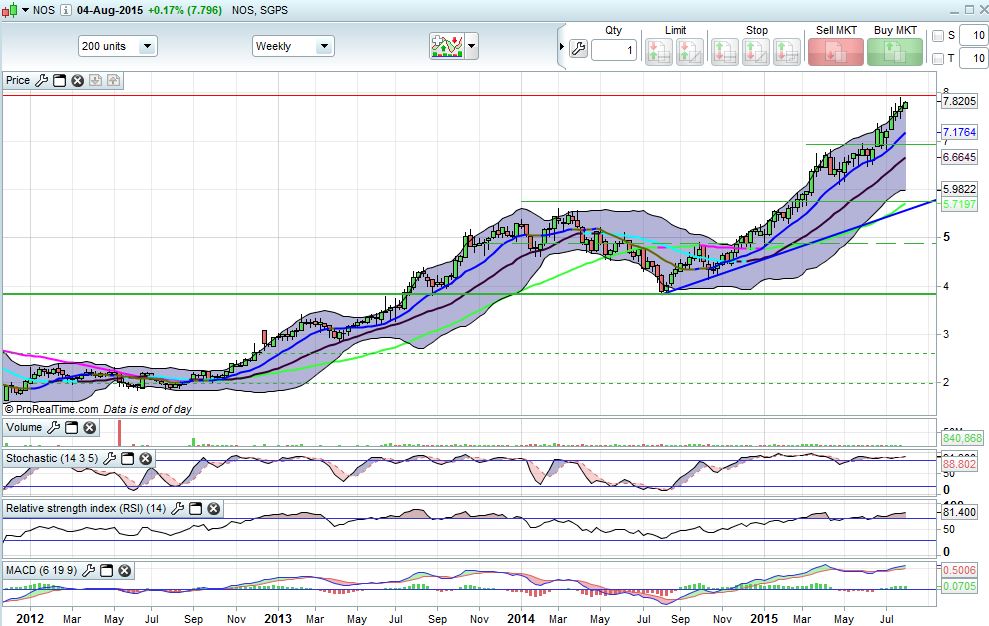 A Nos é das poucas acções na Bolsa portuguesa que continua sob domínio dos touros no médio/Longo prazo, É muito importante, para que os ursos não voltem ao comando, que a zona de suporte entre os 6,85 e 6,95 não seja quebrada.