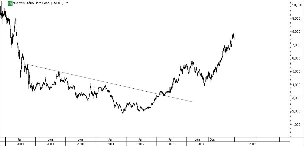 Mas mais do que isso, o mercado desde o ponto mais baixo da NOS em Novembro de 2011 valorizou a cotada em cerca de 400%, de todo o PSI-20 é das únicas acções imune a crises das grécias etc...