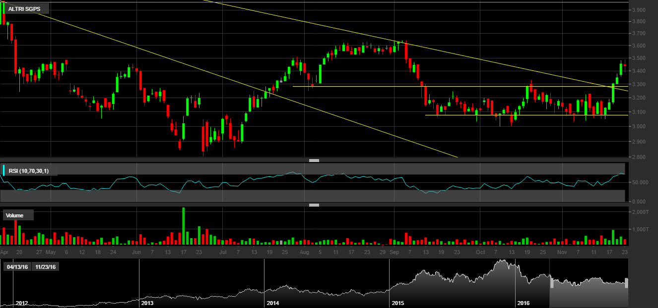 Parece-me que a Altri tem caminho aberto até à próxima resistência, um pouco antes dos 4,0€. A resistência seguinte situa-se já nos 4,45€.