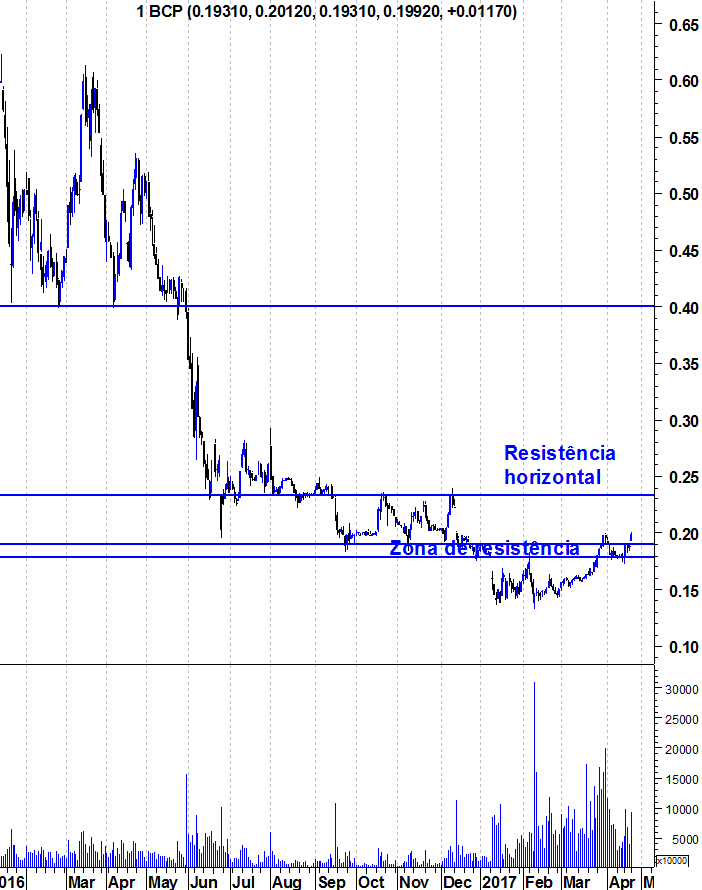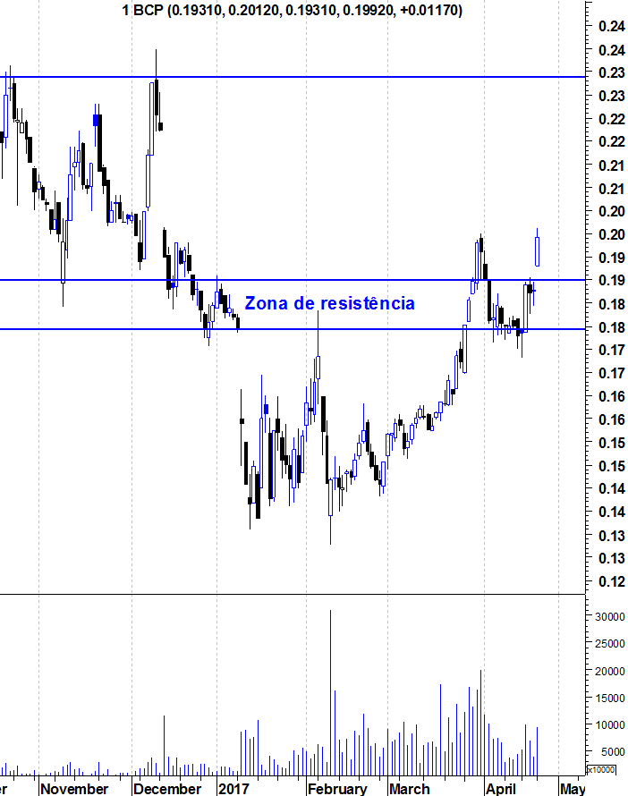 Aqui fica os gráficos do BCP num dia em que a acção está a colocar a cabeça de fora da sua zona de resistência.