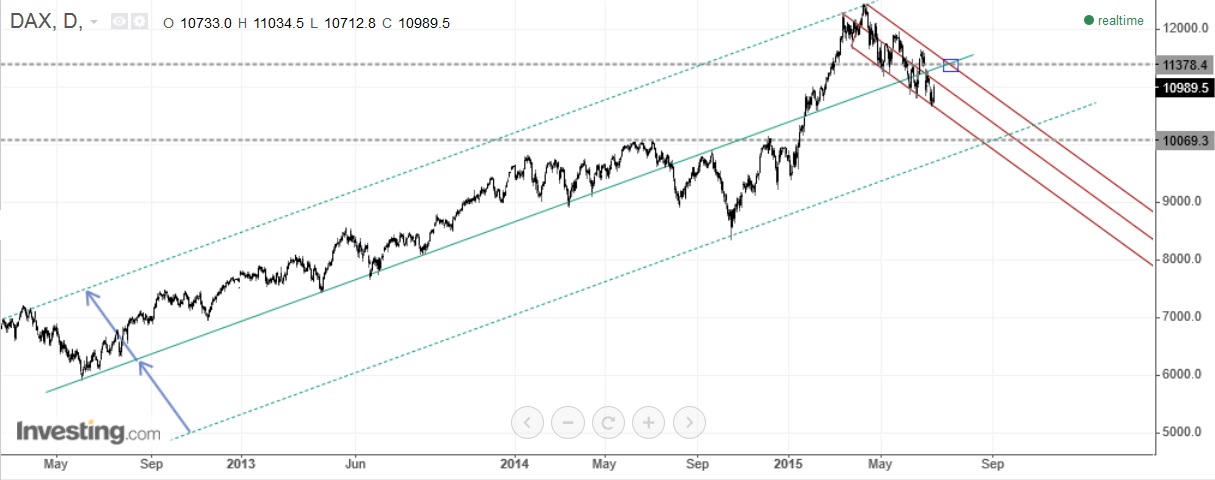volto a deixar o gráfico que tinha deixado há uns dias com a hipótese de canal ascendente no médio/longo prazo, e a vislumbrar uma oportunidade curta na intersecção da linha de pivots - linha média do canal (ou center line), com a linha superior da fork. não foi de propósito, e muito menos sei (nem nunca irei saber) se será coincidência, mas o facto é que a intersecção bate exactamente (com as devidas imprecisões de um gráfico diario) na zona que serviu de suporte ao preço antes do gap down que iniciou este último movimento de descida, e que de resto é uma linha que já serviu de suporte e resistência várias vezes - zona dos 11400. parece-me perfeitamente razoável que o preço lá chegue daqui a uns dias até pq, com estes novos mínimos, voltou a ser confirmada a tendência descendente e esta zona é a próxima resistência a ser testada.