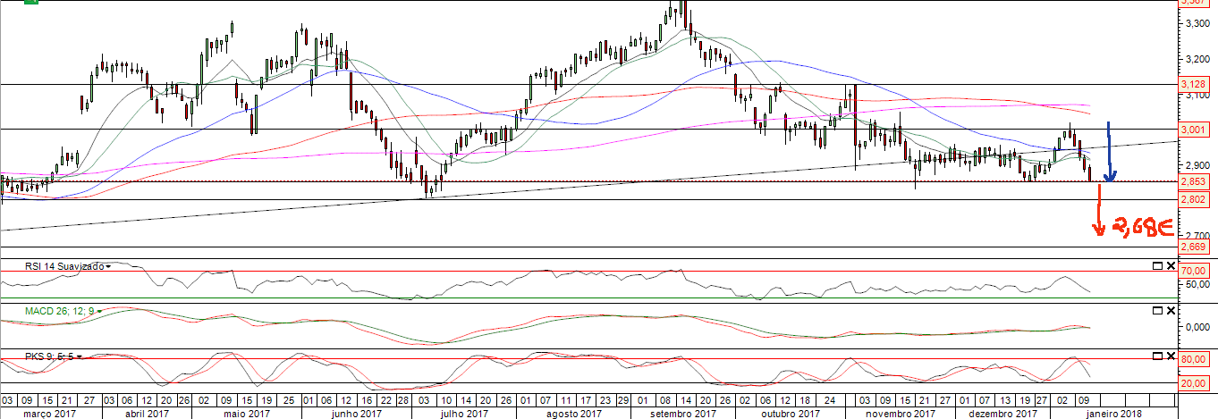 Na base do canal ascendente de muito longo prazo e junto a um suporte relevantíssimo durante 2017 (2,85), o risk reward torna-se outra vez muito muito interessante. E mesmo que fure os 2,90.