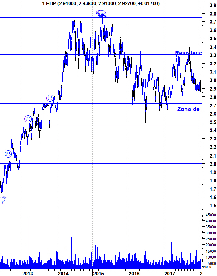 Em termos técnicos, enquanto a EDP se mantiver nesse intervalo lateral há pouco a dizer e também é por isso que tem sido uma acção que raramente tenho analisado, uma vez que as novidades escasseiam. Só quando o intervalo entre os 2,7 e os 3,3 euros for quebrado consistentemente é que teremos encontrada a tendência de médio e longo prazo.