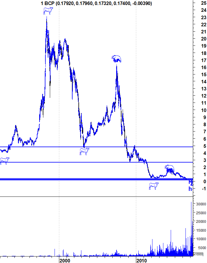 Volto a reafirmar aquilo que tenho vindo a dizer nas últimas semanas: Ao contrário do PSI, o BCP não quebrou consistentemente a sua zona de resistência entre os 0,18 e os 0,19 euros. Enquanto isso não suceder, os ursos continuam no comando da situação em termos de médio e longo prazo.
