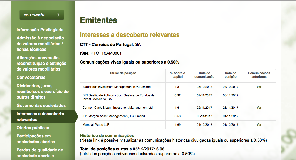 Voltando aos CTT, apagam-me os posts, mas, a realidade é essa, face ao esmagamento concertado da cotação, onde quem vende, espera para re-comprar mais abaixo, todavia, a entaladela é tal, que obriga-se a reforçar... a estratégia errada "ab-initium". (imagem posição CMVM)