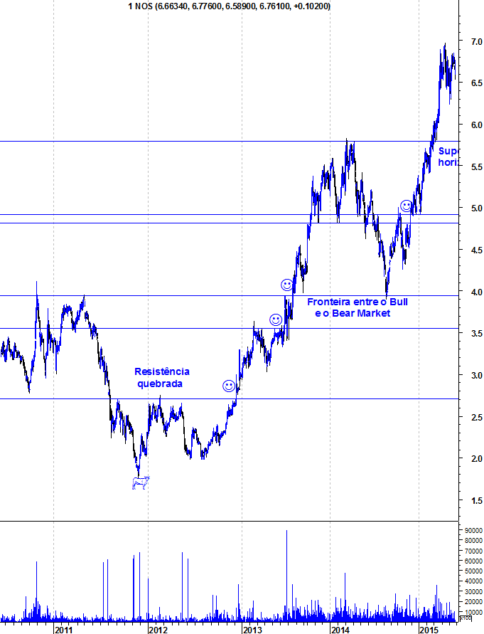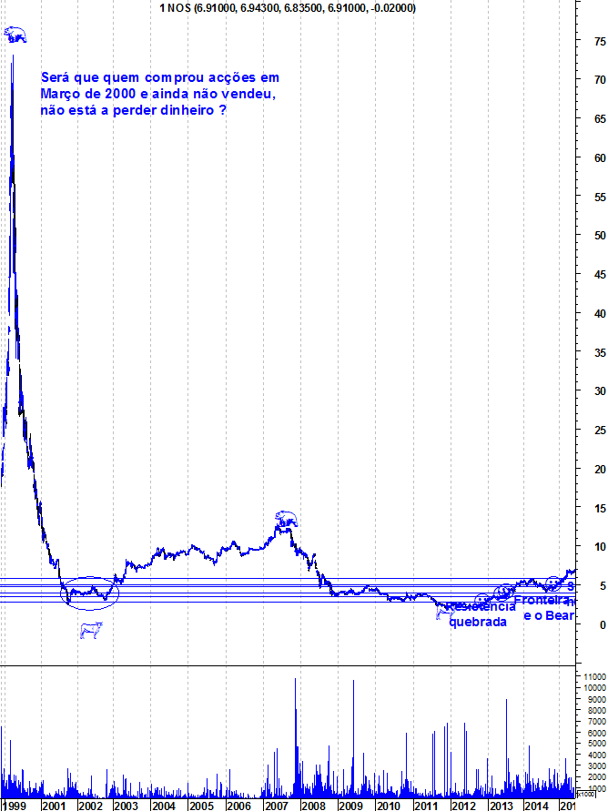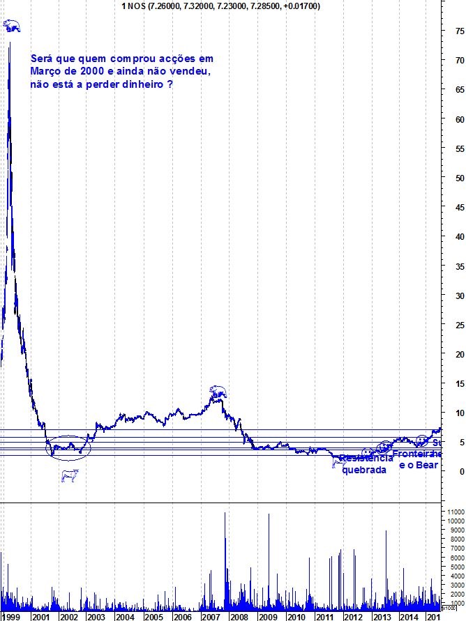 Contra a entrada longa apenas uma resistência horizontal de longo prazo. Se ainda houver memória deste suporte que segurou a ação em 2005 e que deu origem uma enorme descida depois de quebrado em 2008, então o preço poderá uma vez mais retroceder como se verificou em abril passado.