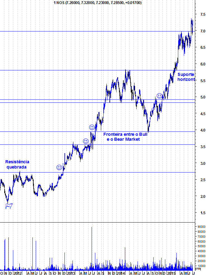 Quando uma acção está em "Bull Market" o pensamento, numa óptica de análise técnica, passa por entrar numa óptica de longo prazo e fugir quando algum suporte importante for quebrado. Curiosamente, a maior parte dos investidores tem medo das acções que sobe e fixam-se nas que caem.