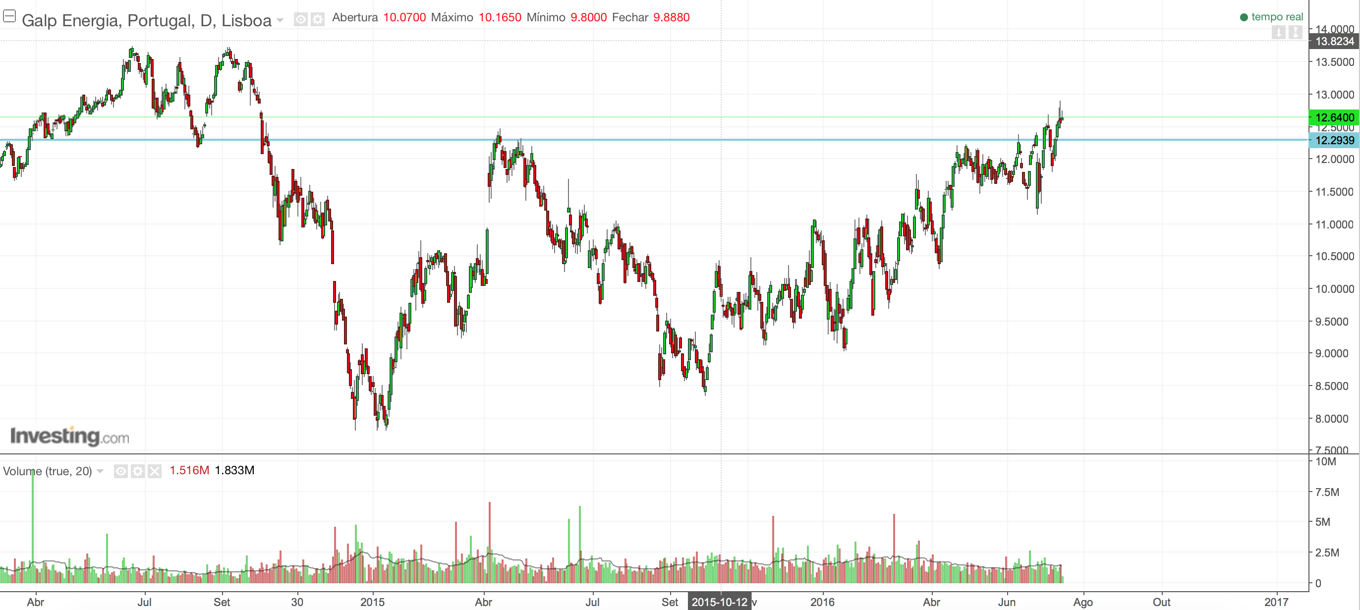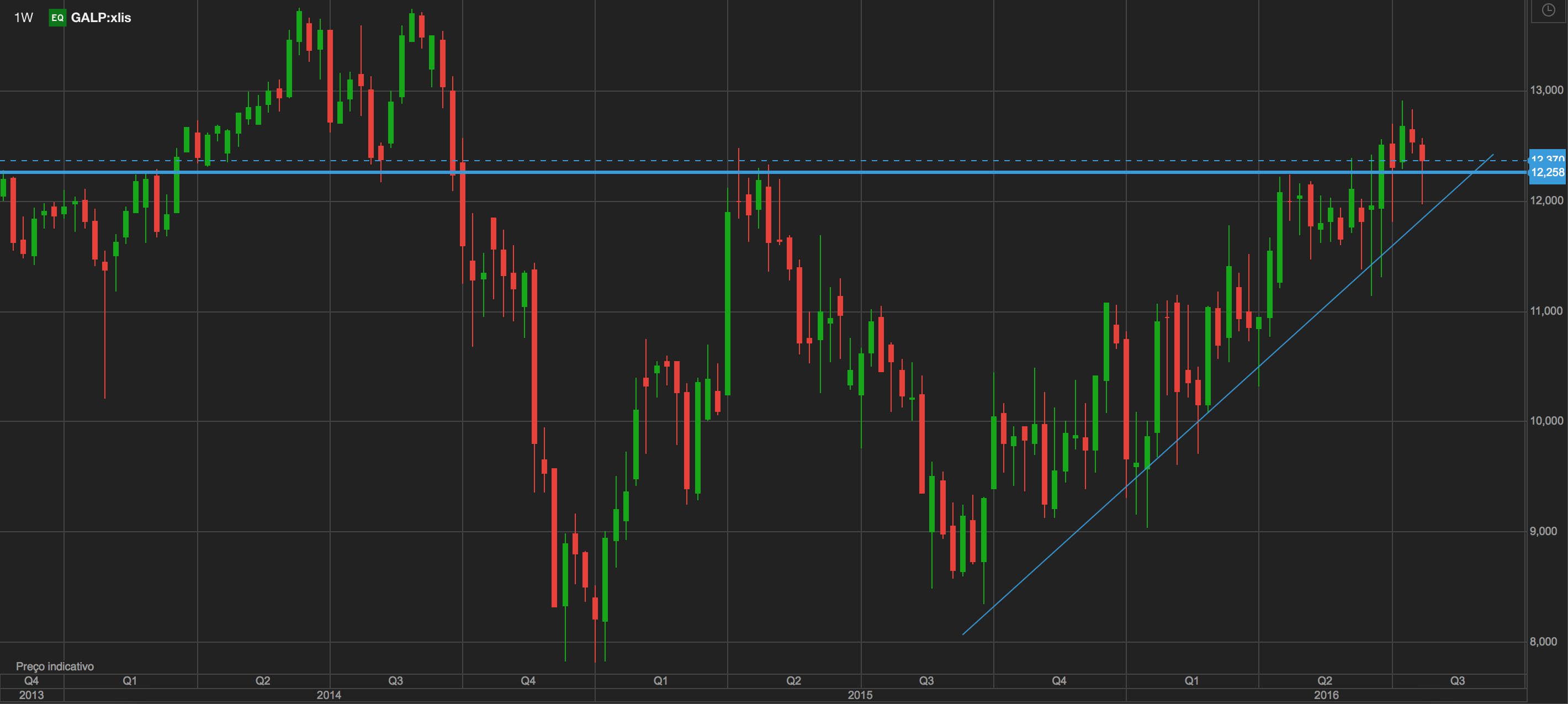 A Galp parece estar numa boa zona de entrada, quebrou resistência aos 12,3€. Mas atenção, as velas estão perigosas e pode haver uma retração a este valor, que esperemos que suporte.