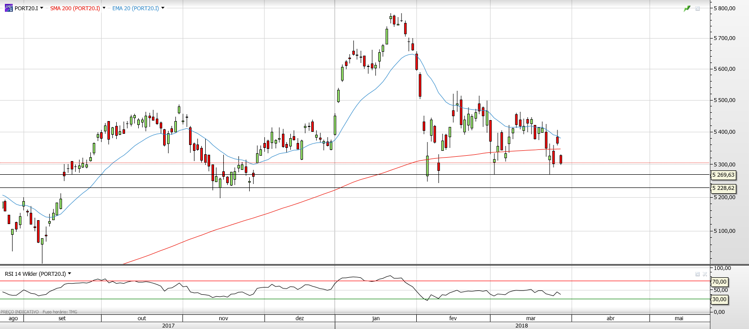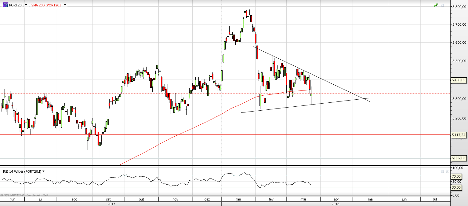 Neste momento tenta aguentar o suporte dos 5350 , anterior resistencia que foi o topo da subida durante vários meses em 2017.