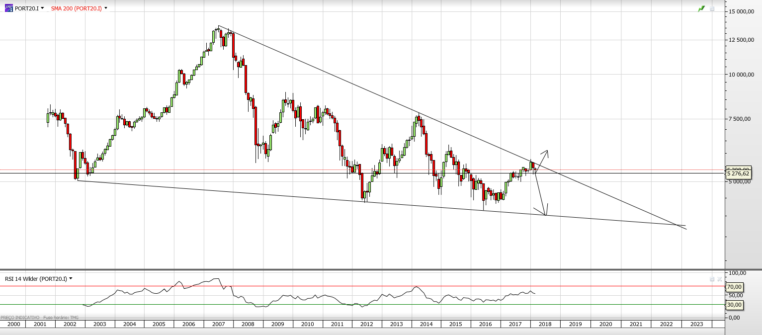 Regressado de uma semana de ausência do Caldeirão, o PSI aproveitou a minha ausência para cair. Olhando para o gráfico não houve nenhuma alteração significativa. OS touros continuam a dominar no médio e longo prazo mas o curto prazo continua em terra de ninguém. Os touros precisam de voltar a conquistar os 5500 pontos para dominarem também no curto prazo, enquanto os ursos precisam que o PSI quebre a zona de suporte nos 5050 pontos para colocarem o domínio dos touros no médio e longo prazo em causa.