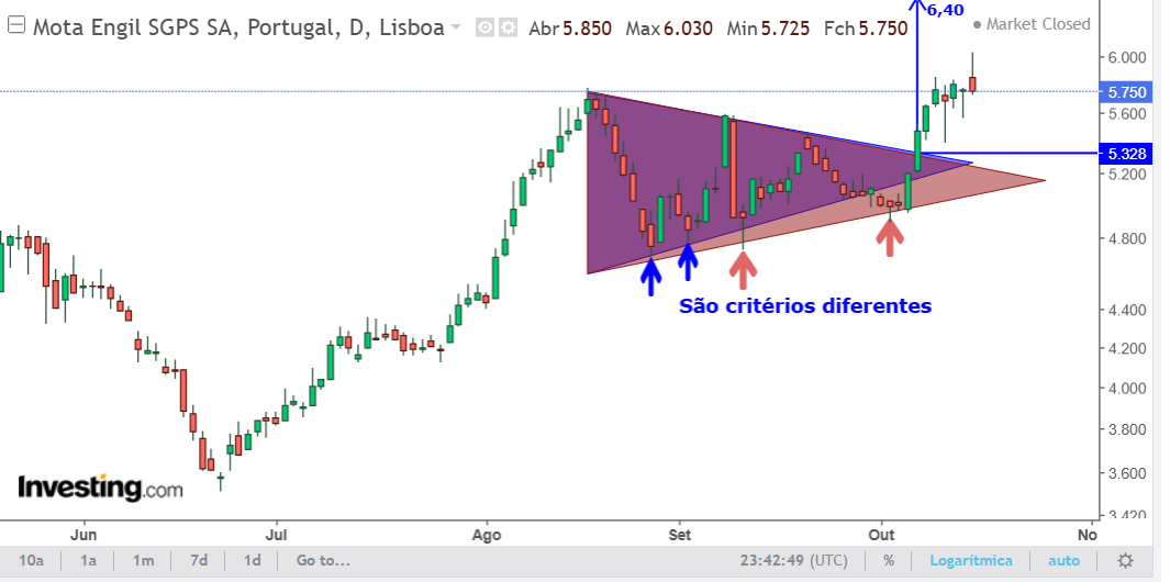 Com o devido ajuste verifica-se que nunca houve quebra pelo downside mas sim breakout pelo upside, com 6 dias de confirmação!