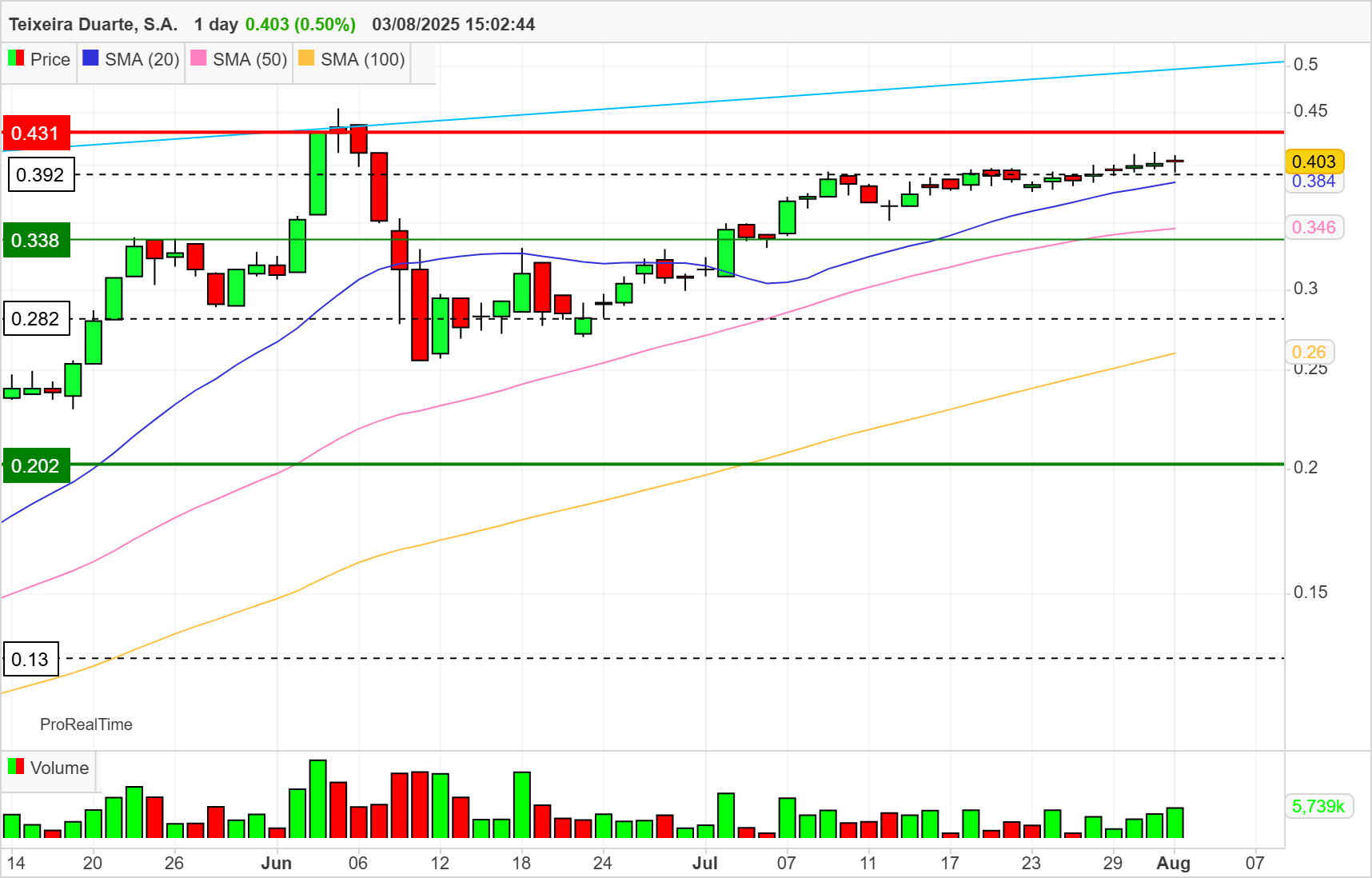E fecho semanal acima dos 0,40€ , agora até ao final do mês o caminho até aos 0,50€ para ser feito os 440M euros em carteira do TGV ajudam e a cereja em cima do bolo deverão ser os resultados semestrais a ser divulgados dia 22 de Agosto .