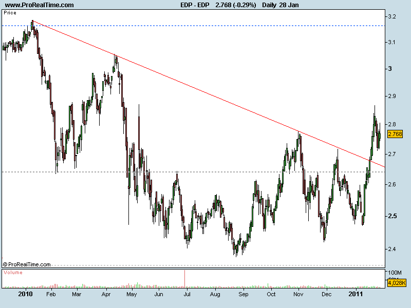 esta aproxima-se agora da importante resistência dos 2.1, enquanto que a eléctrica rompeu em grande estilo quer a resistência dos 2.64 quer a LTd (em linha com o sector europeu)