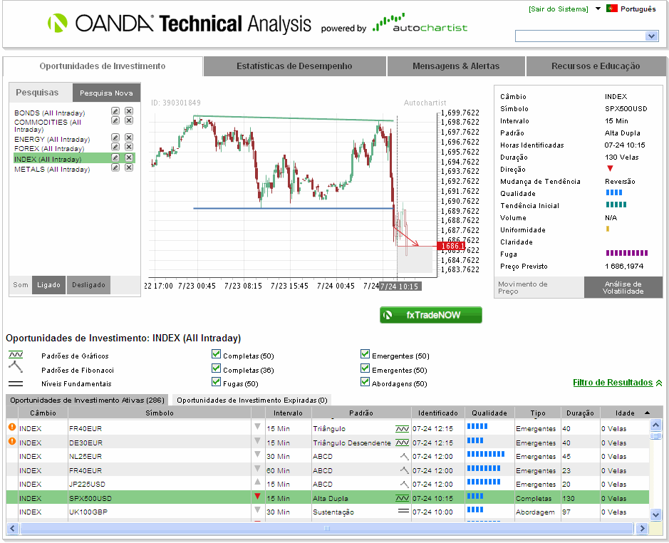 A titulo de curiosidade, a Oanda, recentemente colocou à disposição dos seus clientes os resultados de um sistema computacional de analise de gráficos.Os outputs de um algoritmo.As vantagens é que são dados alertas sempre que um ativo está a dar um sinal de saída/entrada.Dispensando aos cliente a trabalheira de analisar dezenas de ativos de modo a decidir-se por qual é melhor optar naquele dia.