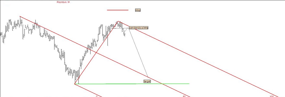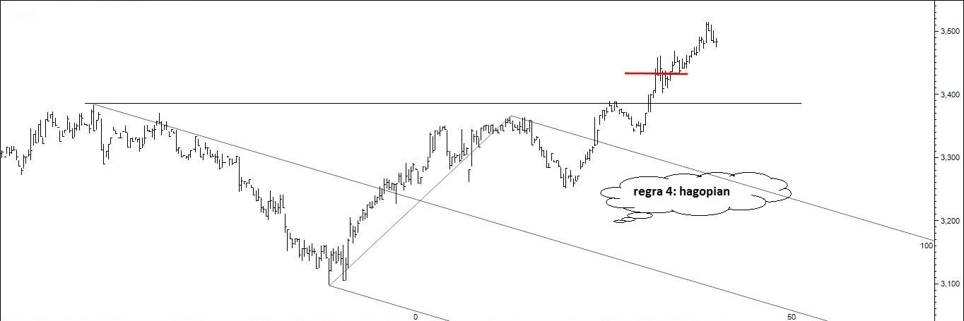 Stoploss activada na sequência de um movimento hagopiano (regra 4: When prices reverse before reaching the ML, leaving a “space”, they will move more in the opposite direction than when prices were rising toward the ML).