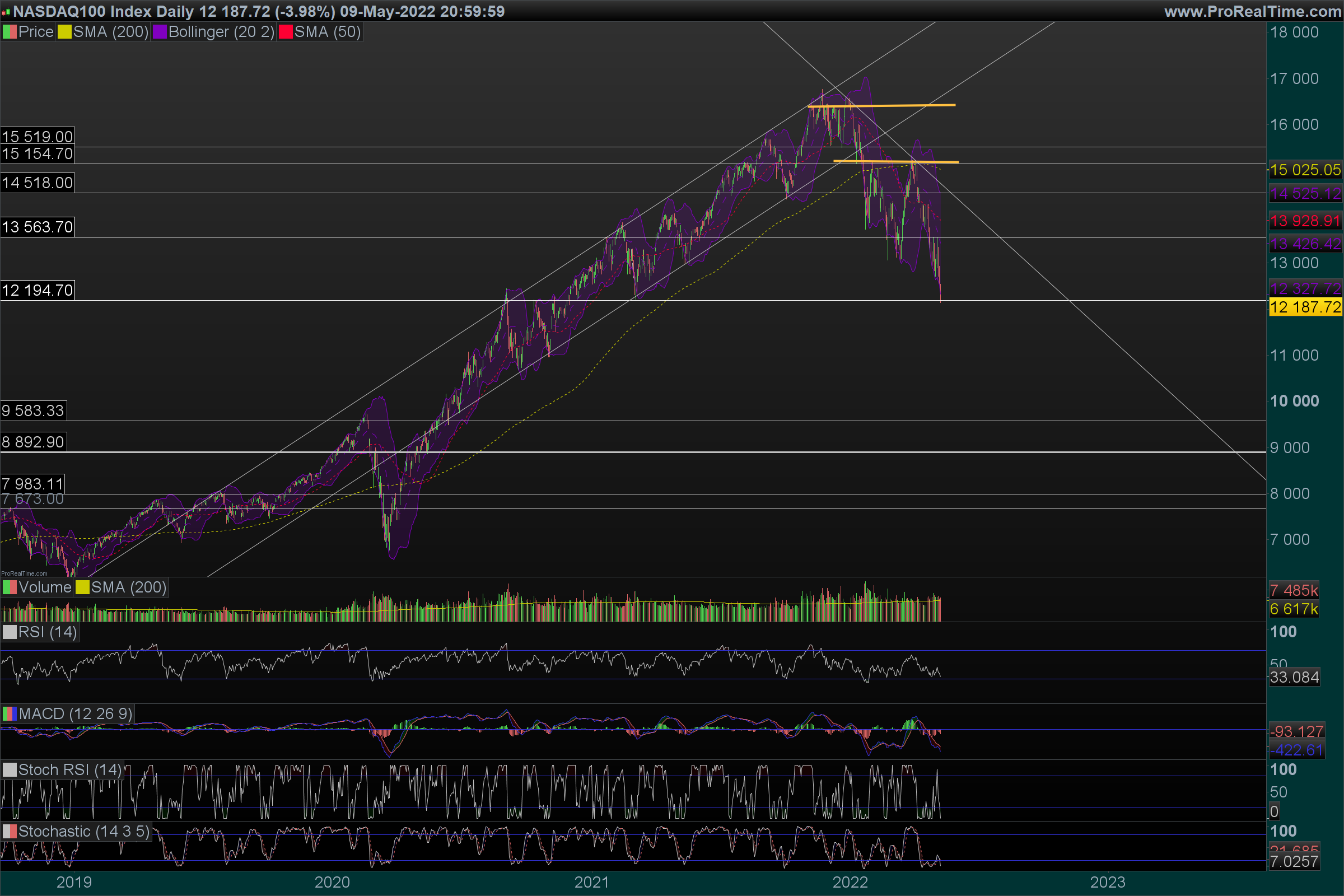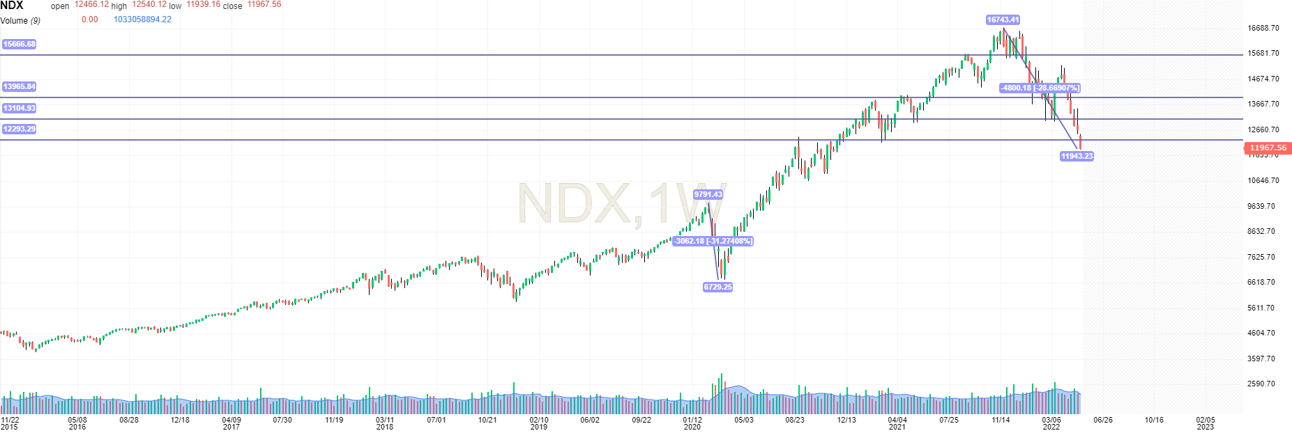 Neste momento acredito que está em cima do ultimo suporte que poderia considerar antes de uma eventual crise como a do .com em que nos vamos continuar a afastar de máximos que não voltaremos a ver nas próximos anos. No .com o NASDAQ demorou 16 anos a fazer novos máximos! Teve de ser vir a geração seguinte para voltar a trazer credibilidade às tecnologias.