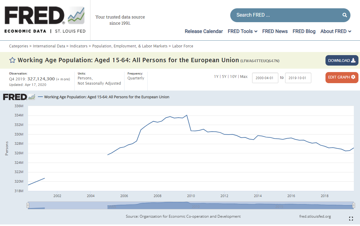 Custa-me a acreditar numa repetição de uma crise tão prolongada. Deixo um gráfico que expoem o meu cepticismo. A demografia ocidental está caótica, cada vez temos uma população maior fora do rango da zona de "working age" que temos de suportar ao mesmo tempo que temos uma piramide invertida, impossibilitando um refresh da força laboral. Tenho a certeza que não fossem estes factores, mais a UE comunista com recordes de emprego estatal um pouco por todos os membros.