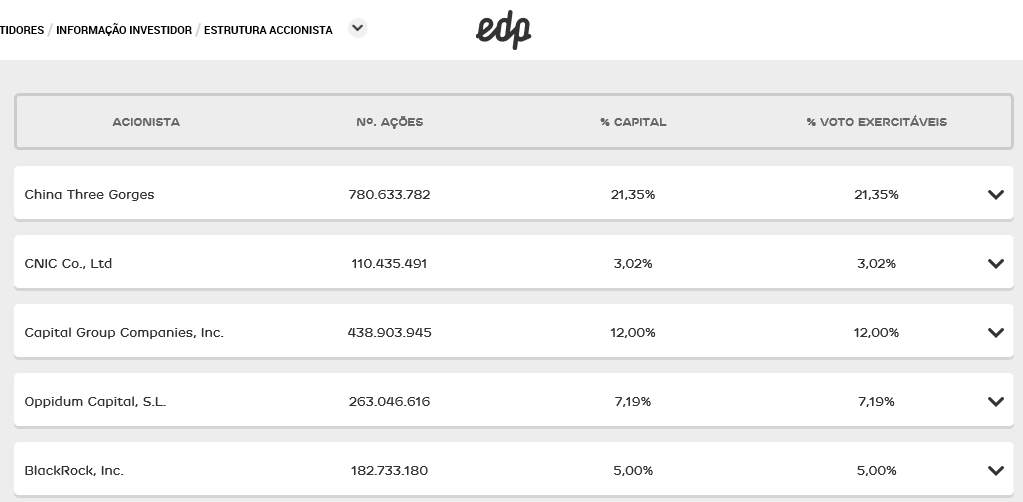 A ultima posição conhecida que encontro no site da EDP é de 12% ( Assumo que será ultima participação conhecida ) em 23-08-2017