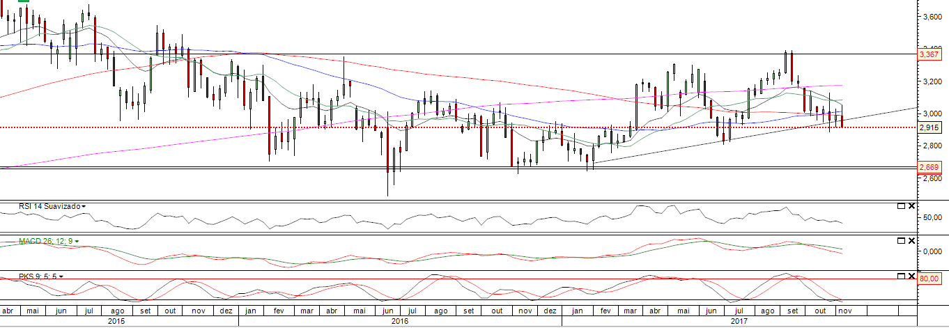 A cotada fechou a semana em mínimos nos 2.915, abaixo do anterior suporte dos 2.95 e já bem abaixo das MM50 e MM200