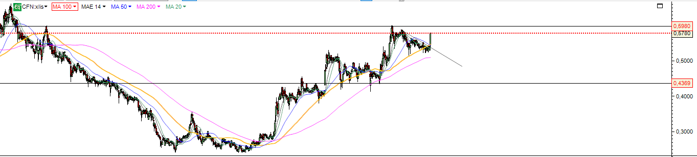A forte procura hoje que já vai para lá de 1 milhão de títulos transacionados o que não é normal está a levar a cotação para uma valorização mt boa, os resultados ajudaram, se assim continuar nos próximos tempos a zona dos 0,6 será rapidamente ultrapassada nos próximos dias e os 0,7 será a próxima barreira