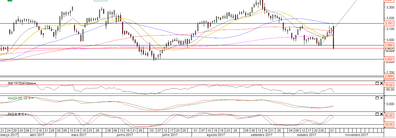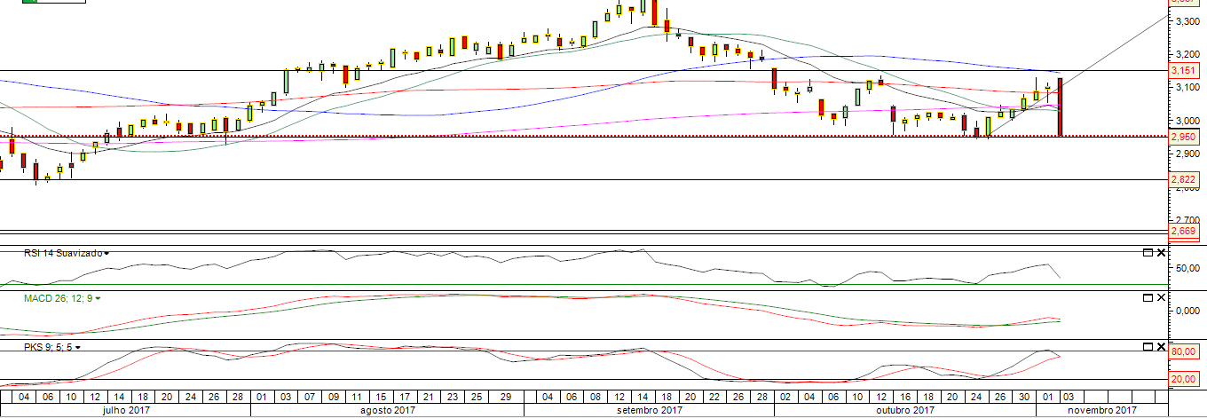 Desde que começaram a surgir incertezas CMEC e processos investigação o titulo iniciou a tendência descendente com pequenas recuperação contidas , mas as quedas a cada fator negativo , são cada vez mais violentas e com maior volume , com o GAP nos 3.10 e esta queda fortíssima de sexta com enorme volume , o que me leva a incorporar um forte fator de cautela para futuro desempenho do titulo pelo menos até final do ano.