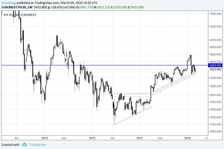 Aqui ficam os gráficos actualizados do PSI. Os 5500 pontos continuam a ser a resistência que os touros têm que vencer para voltarem a dominar no curto prazo, uma vez que no médio e longo prazo continuam reis e senhores.