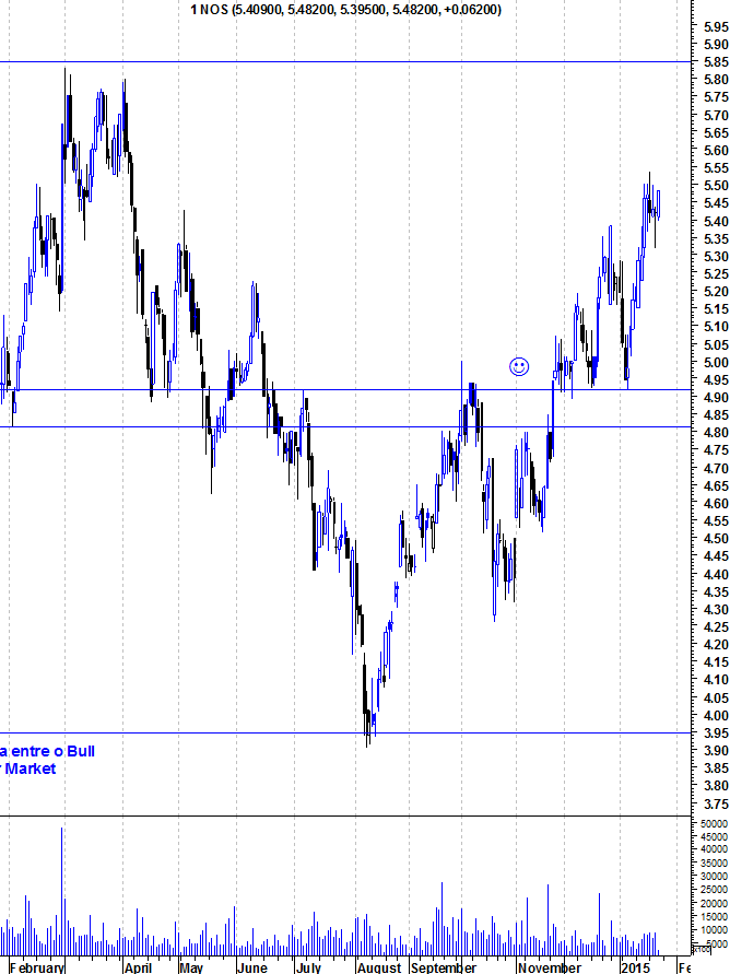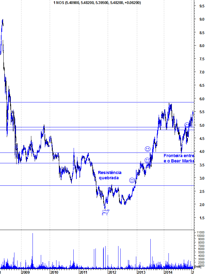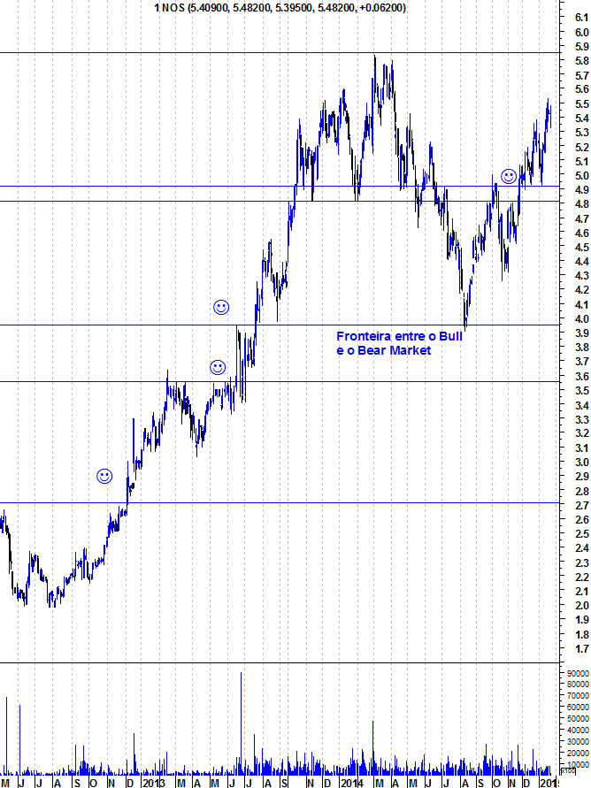 Aqui ficam os gráficos actualizados da Nos, uma das acções que, ao longo dos últimos meses, mais resiliência mostrou e que continua a ser das acções com melhor aspecto da Bolsa portuguesa, tendo resistido à quebra do suporte que a colocaria em "Bear Market".
