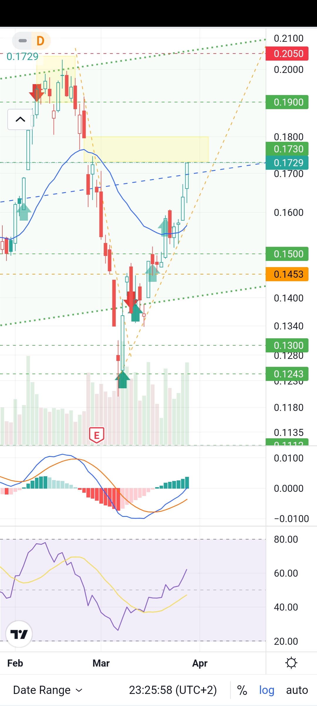Acho que ainda não esgotamos o movimento de subida, mesmo com a resistência ali por perto mas não sei se terá força para neste movimento ir até lá acima, aos 0,20. Se passar a resistência e o ambiente otimista/de expectativa positiva se mantiver não vejo nada que o impeça em meia duzia de sessões.