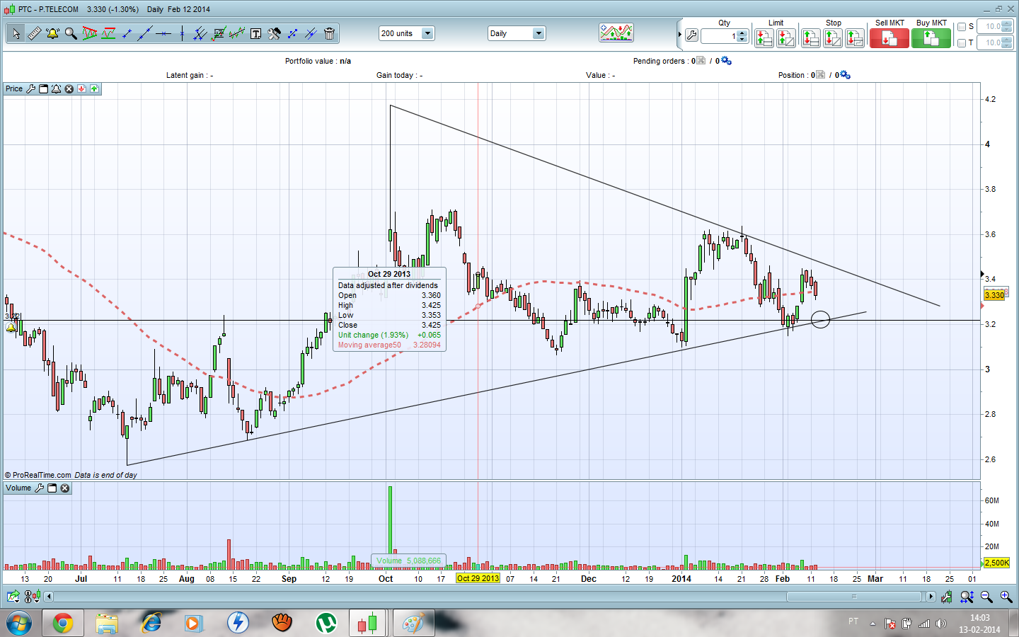 Independente da fusão com a Oi, vou me seguir pelo gráfico da PT. Sei que pode não ser o mais correcto mas vou tentar esperar por ela para uma entrada nos 3.22 ( aproximadamente). Não deve fugir muito disto, vamos aguardar..