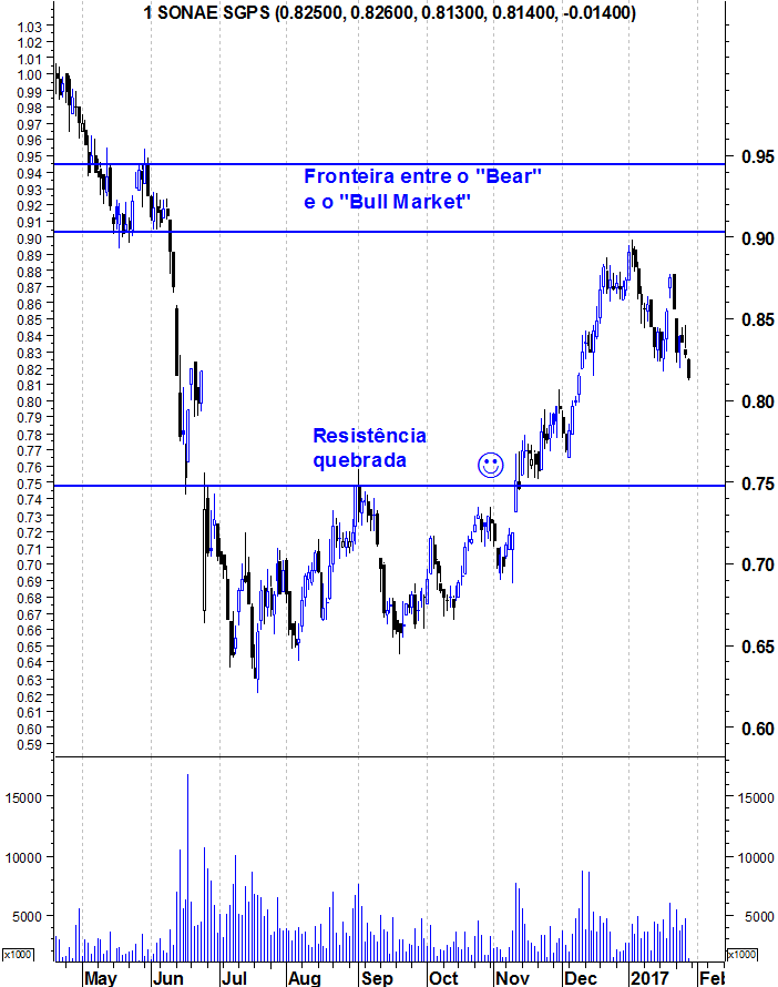 Sem querer responder pelo Ulisses, acho que a zona dos 0.75 serão decisivos. Caso quebre em baixa, será um péssimo sinal e os Ursos voltam a tomar por completo conta da ação. Caso reaja em alta nos próximos dias, acho que tem margem para voltar a zona perto dos 0.9.