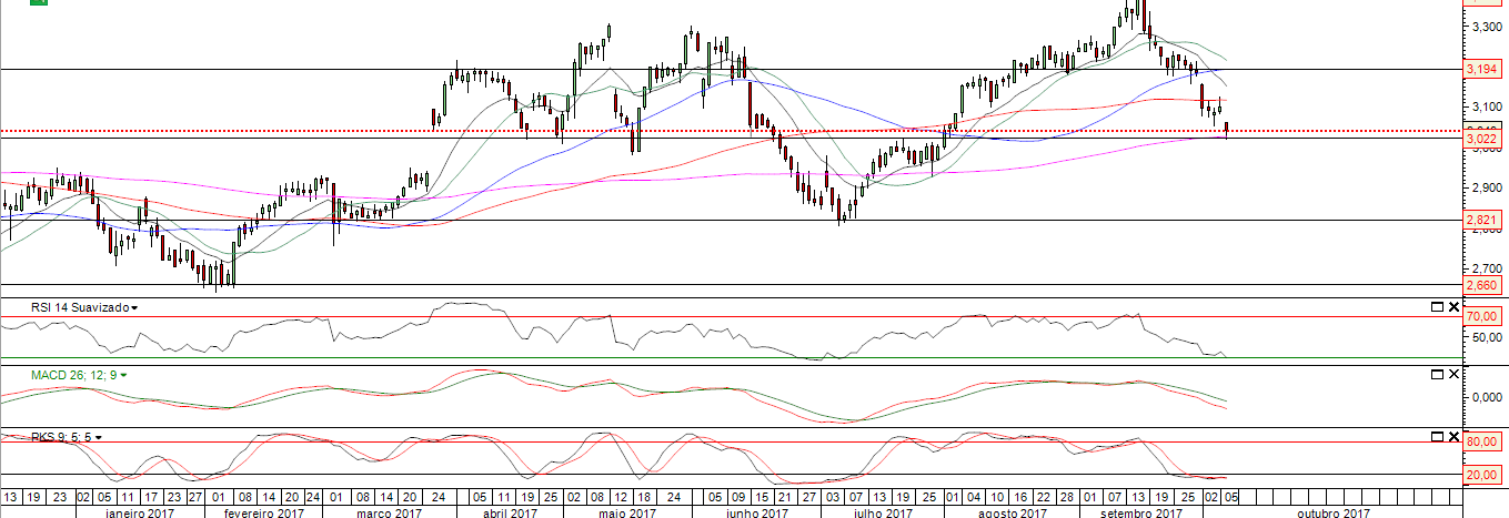 -MACD: linha de sinal abaixo de zero, sendo que a linha MACD quase que cruzava a linha de sinal; quando houver este cruzamento, a cotada terá tudo para subir;