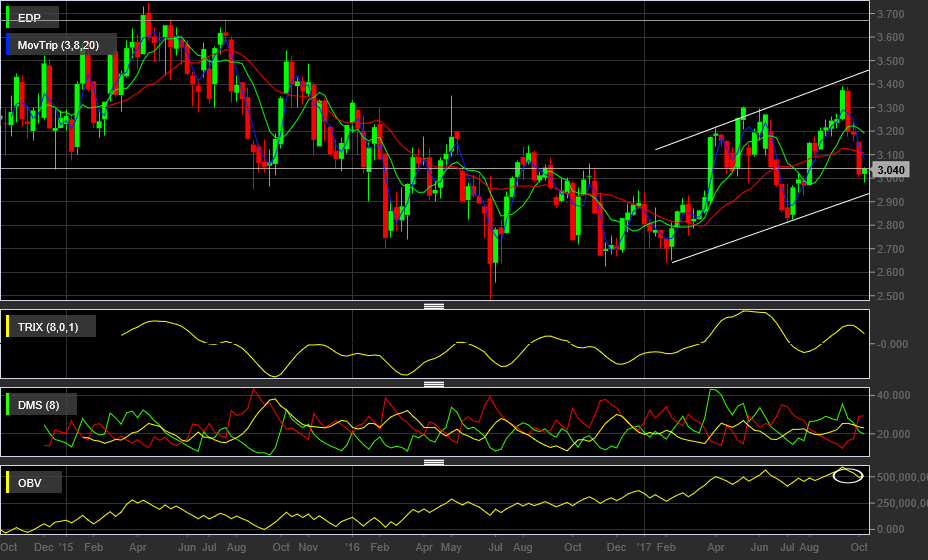Como disse no meu comentário anterior, os valores desta cotada mantém-se, considerando esta uma correção onde poderei aproveitar para reforçar (preferencialmente quando a linha MACD estiver perto de um cruzamento com a linha de sinal, numa perspetiva pelo menos 2H/4H), quanto à OBV e TRIX irão naturalmente subir quando a perspetiva dos investidores mudar (ou se esquecer um pouco este assunto dos CMEC, que brevemente será descontado na totalidade, caso ainda não o esteja).