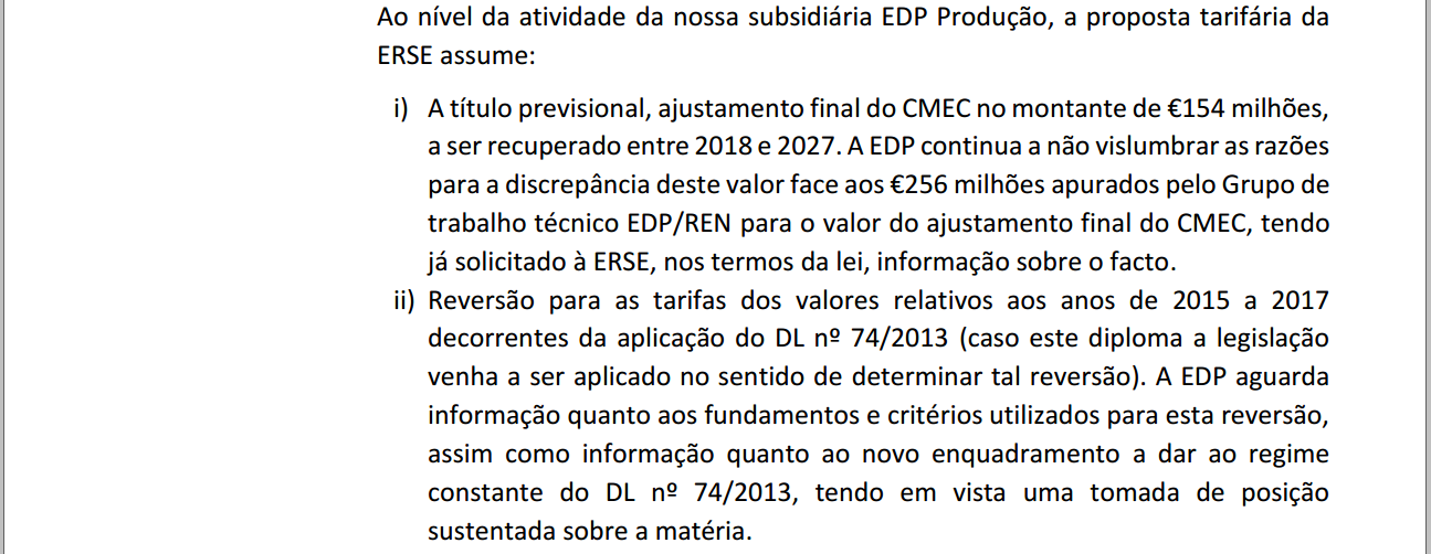 "Na nota, os analistas da casa de investimento com capitais chineses reagem aos parâmetros regulatórios para 2018 e 2020 que foram divulgados na semana passada e aos quais a EDP reagiu este domingo. Os CMEC – custos para a manutenção do equilíbrio contratual –, que asseguram receitas à empresa, sentiram um aperto por parte do regulador (ERSE), gerando menos impacto positivo do que o esperado pelo Haitong. Além disso, as receitas garantidas deslizaram, dando menos a ganhar à eléctrica. "