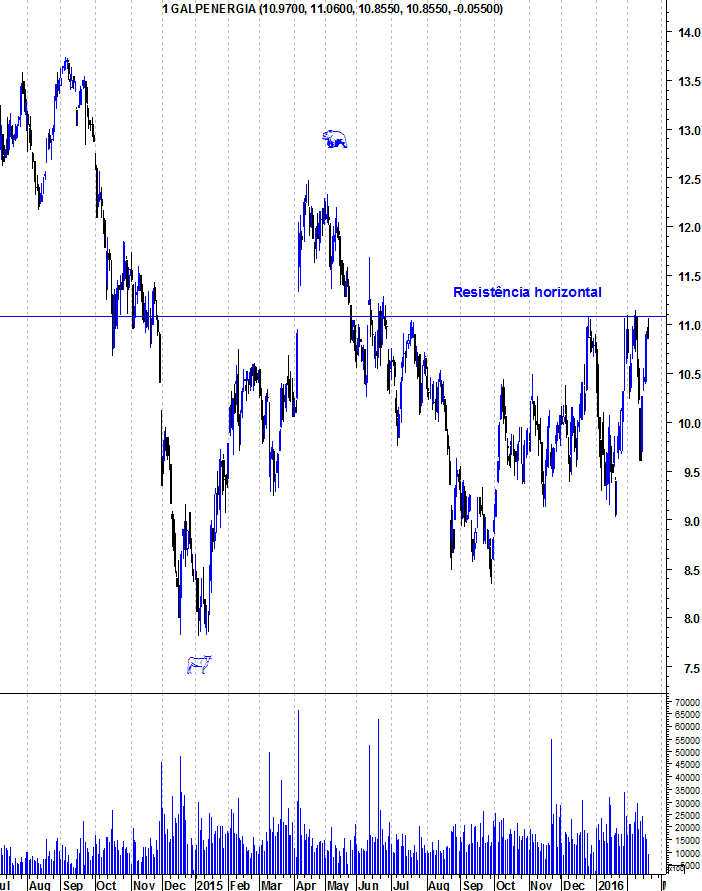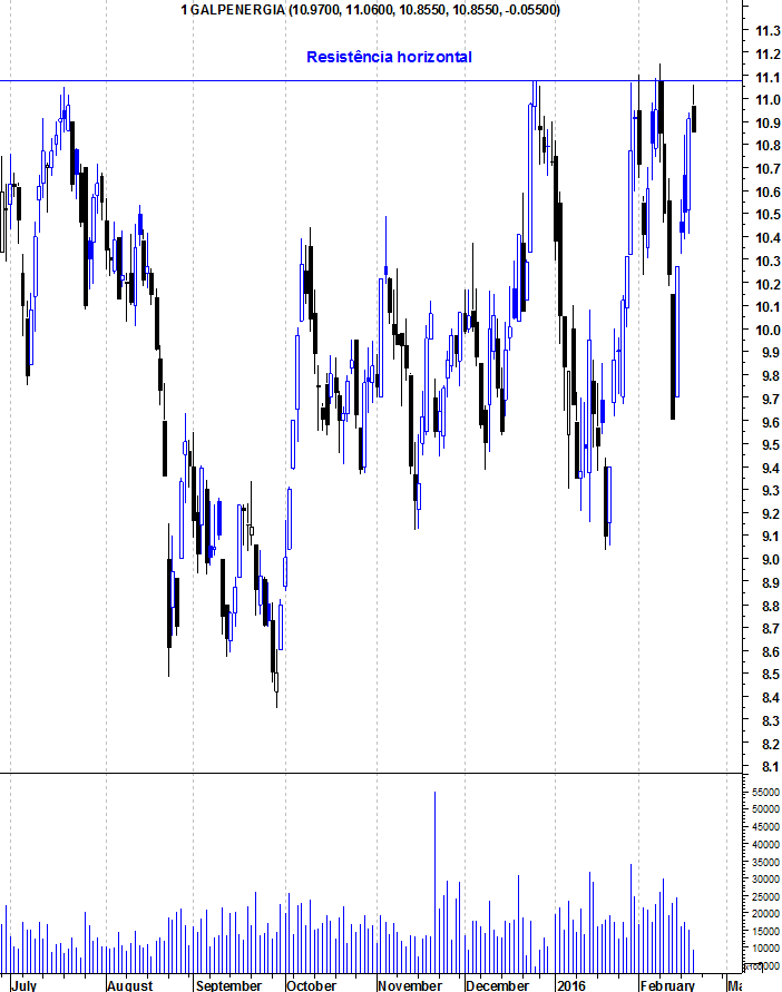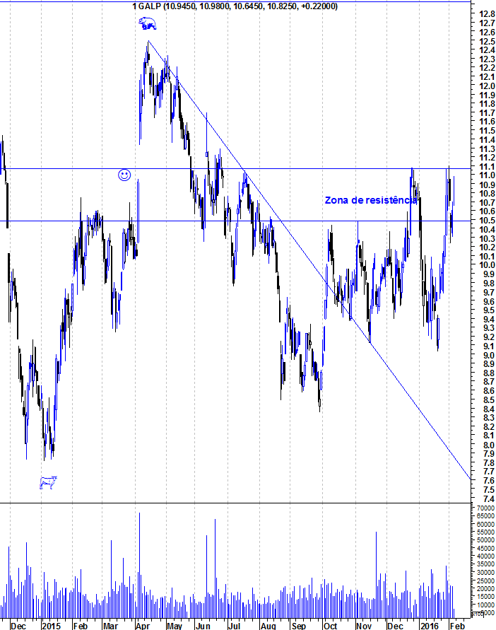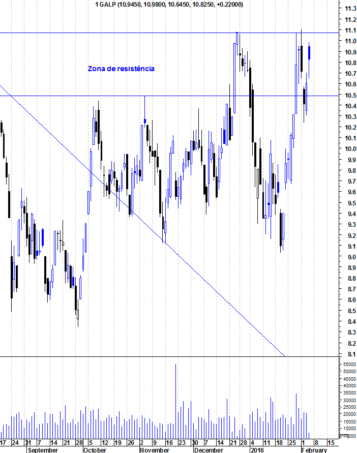A Galp tem mostrado força relativa nos últimos meses, aguentando-se mesmo com a Bolsa portuguesa em maus lençóis. Apesar disso, o facto de estar perto da sua resistência na zona dos 11,10 euros, faz com que seja perigosas entradas junto a essa resistência pois aumenta a probabilidade de se apanhar uma retracção. Quando a resistência for quebrada, será mais um sinal de força da Galp e abrirá espaço para mais altos voos.