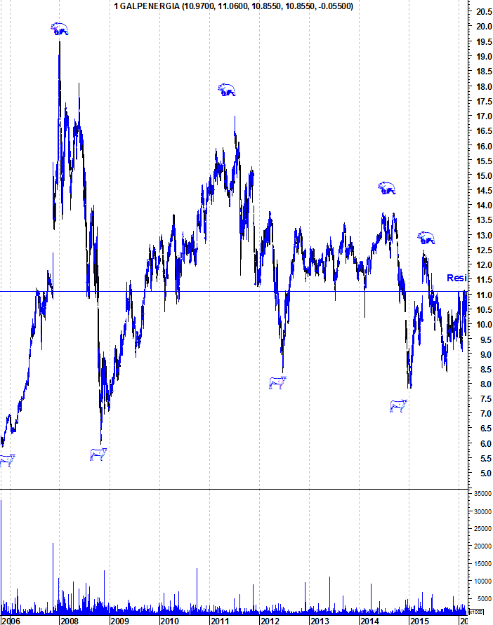 A Galp continua a mostrar o inconformismo dos últimos 4 meses, conseguindo um excelente desempenho, mesmo com o PSI esfrangalhado. Nesta altura, volta a estar na zona de uma resistência muito forte e importante. Caso seja quebrada, os touros deixam apenas de estar no comando da situação no curto e médio prazo e asseguram também o domínio no longo prazo.
