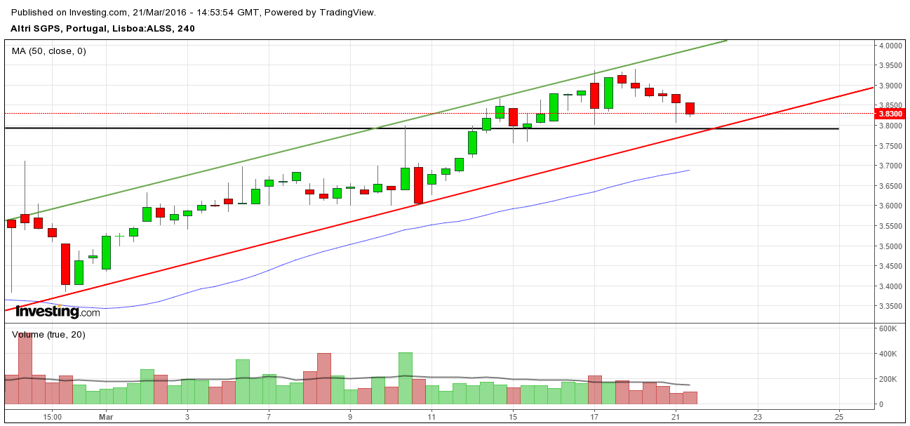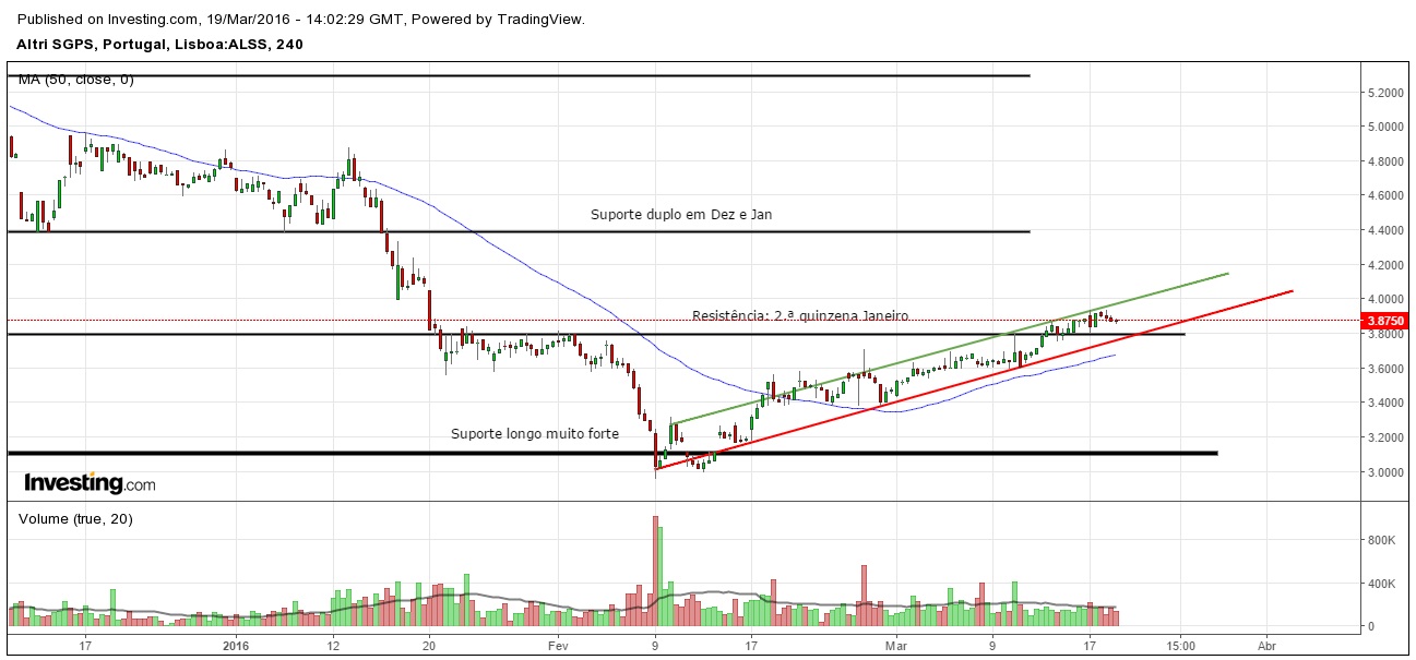 No início de Fevereiro de 2016, a tendência de descida da Altri foi parada pela fortíssima linha de suporte da acção que ficou definida no longínquo, mas muito importante, outro mês de Fevereiro ( 2011), em valores que rondam 3,10 euros.